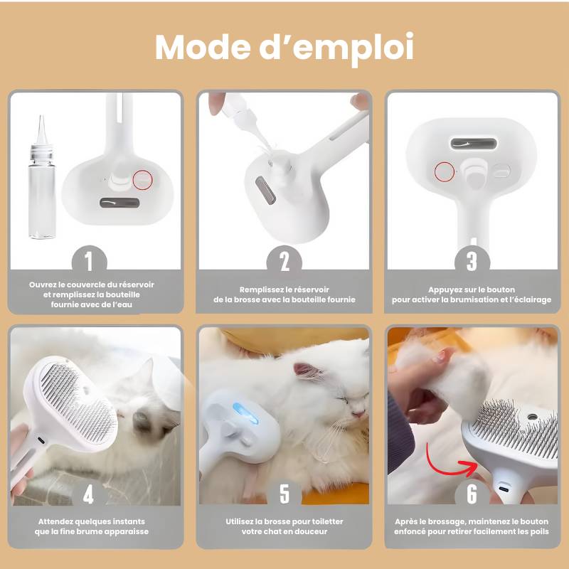 Conçue pour les chiens et chats qui détestent le brossage, cette brosse combine brume rafraîchissante, démêlage doux et bouton d’éjection des poils pour un toilettage simple, efficace et agréable.